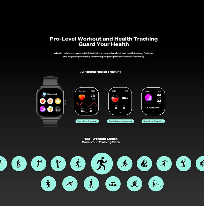 pro-Level Workout and Health Tracking Guard Your Health A health advisor on your wrist! Inbuilt with advanced workout and health tracking features, ensuring comprehensive monitoring for peak performance and well-being.