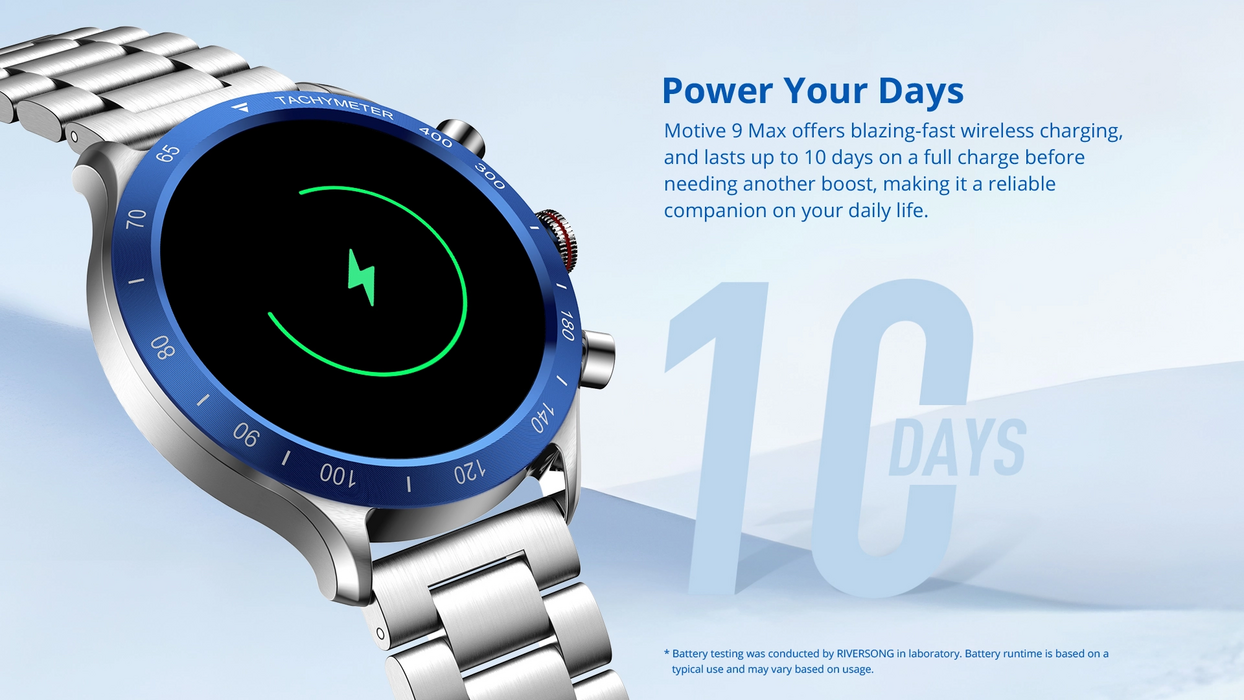 The Motive 9 Max smartwatch combines elegant design with powerful performance to be your perfect daily companion. It features a 1.43-inch AMOLED display with tempered glass for clearer visuals. With support for over 100 workout modes, it accurately tracks all your activities, while offering comprehensive 24/7 health monitoring including heart rate, blood oxygen (SpO2), and stress levels. The battery lasts up to 10 days with fast wireless charging.